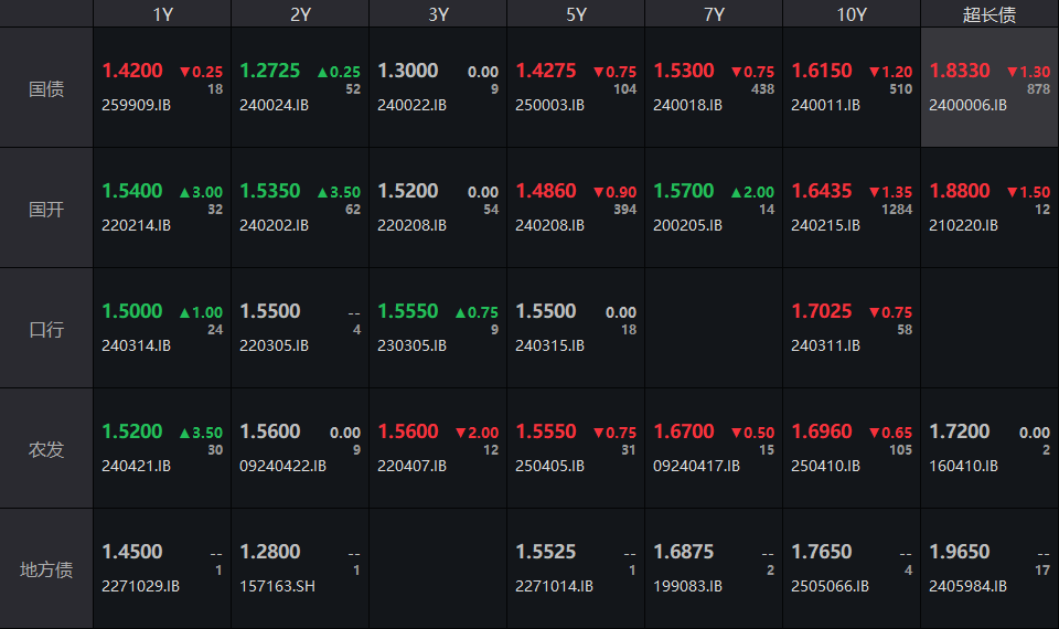 银行间主要利率债收益率多数下行,截至下午16:30,10年期国债活跃券240011收益率报1.6165%,30年期国债活跃券2400006收益率报1.833%,10年期国开活跃券240215收益率报1.643%。