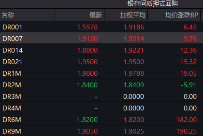 银行间回购定盘利率全线上涨。FR001涨13.0个基点报1.98%;FR007涨18.0个基点报1.98%;FR014涨15.0个基点报1.98%。