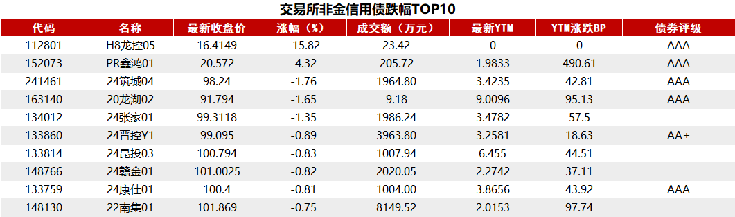 据Choice 数据统计显示,今日交易所市场非金信用债跌幅排行前五的分别是:H8龙控05、PR鑫鸿01、24筑城04、20龙湖02、24张家01。具体如下: