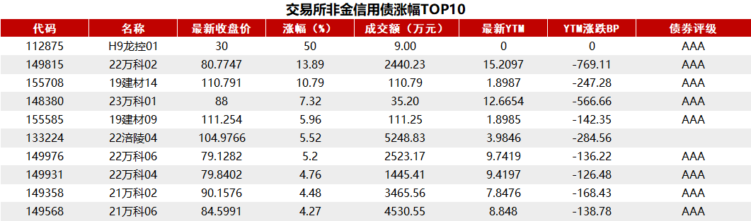 据Choice 数据统计显示,今日交易所市场非金信用债涨幅排行前五的分别是:H9龙控01、22万科02、19建材14、23万科01、19建材09。具体如下: