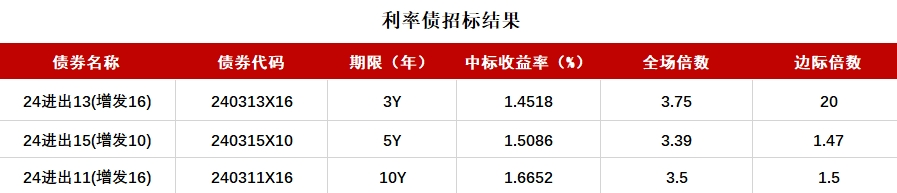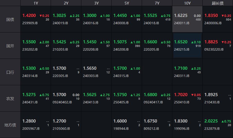 银行间主要利率债收益率多数上行,截至下午16:30,10年期国债活跃券240011收益率持平报1.6225%,30年期国债活跃券2400006收益率下行0.35bp报1.835%,10年期国开活跃券240215收益率上行0.1bp报1.652%。