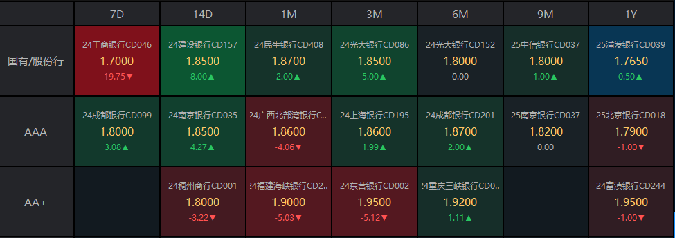 资金面方面,Shibor短端品种多数下行。隔夜品种下行0.5BP报1.827%;7天期下行8.2BP报1.763%;14天期下行5.4BP报1.815%;1个月期上行0.4BP报1.719%。银行间回购定盘利率集体下跌,银银间回购定盘利率全线下跌。