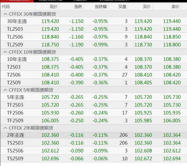 截至2月18日午间收盘,国债期货全线收跌。其中,30年期国债期货下跌0.95%,报119.42元;10年期国债期货下跌0.37%,报108.375元;5年期国债期货下跌0.25%,报105.72元;2年期国债期货下跌0.11%,报102.36元。