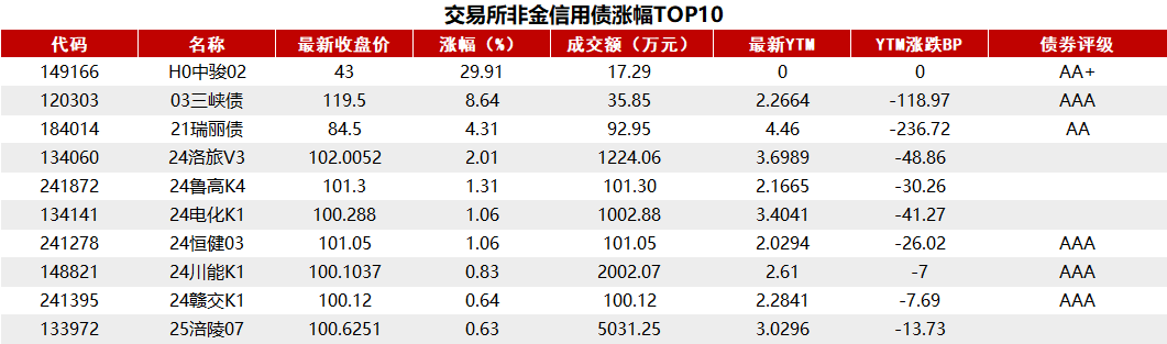 同样,据Choice数据统计,今日交易所市场非金信用债涨幅前五分别为:H0中骏02、03三峡债、21瑞丽债、24洛旅V3、24鲁高K4。具体情况如下: