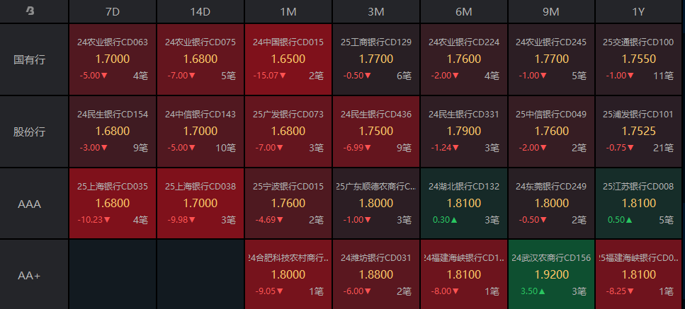 存单方面,今日3个月期国股存单需求较好,利率在1.72%-1.77%之间,较前一日下行3bp;1年期国股存单利率报在1.75%-1.79%,较前一日下行1bp。AAA级存单方面,9个月期成交利率为1.76%,1年期成交利率为1.7525%。