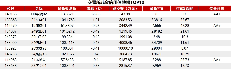 据Choice 数据统计显示,今日交易所市场非金信用债跌幅排行前五的分别是:H0中骏02、24文蓝01、19道桥01、24鹤山01、25中飞02。具体如下: