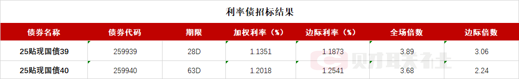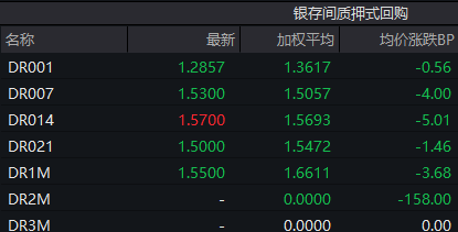 银行间回购定盘利率全线下跌。FR001跌1.0个基点报1.44%;FR007跌2.36个基点报1.58%;FR014跌5.0个基点报1.6%。
