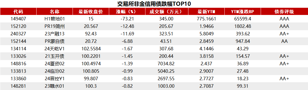据Choice 数据统计显示,今日交易所市场非金信用债跌幅排行前五的分别是:H1碧地01、PR19简州、23产融13、PR蒙自债、24天屹V1。具体如下: