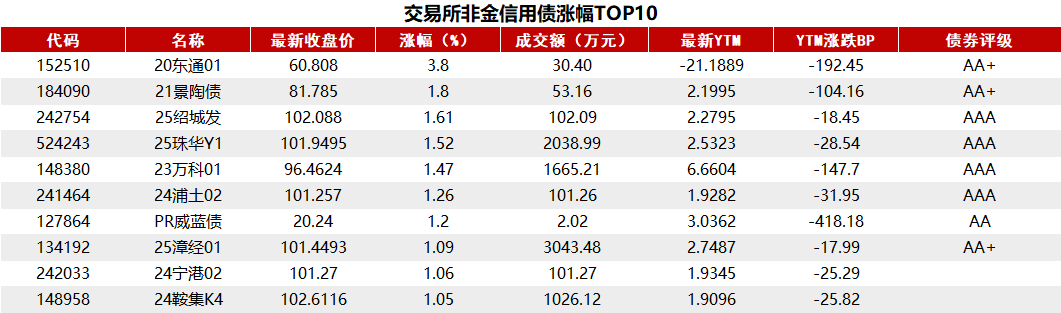 据Choice 数据统计显示,今日交易所市场非金信用债涨幅排行前五的分别是:20东通01、21景陶债、25绍城发、25珠华Y1、23万科01。具体如下: