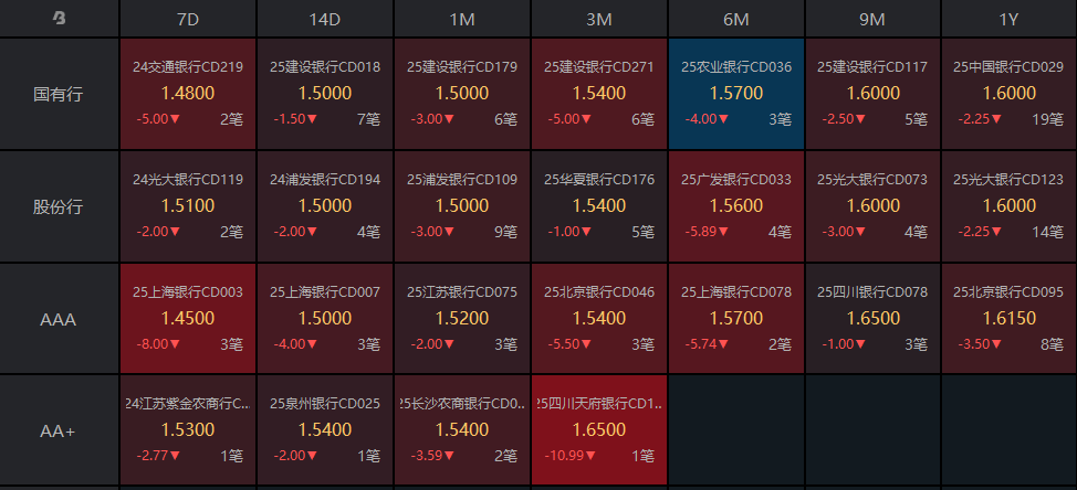 存单方面,今日3M期国股在1.5%-1.55%位置需求较好,较前一日下行5bp,1Y期国股报在1.5975%-1.62%的位置,较前一日下行2.25bp,AAA级存单方面,9M成交在1.65%,1Y成交在1.615%的位置。