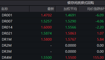 银银间回购定盘利率全线下跌。FDR001跌7.0个基点报1.48%;FDR007跌5.0个基点报1.53%;FDR014跌3.0个基点报1.55%。
