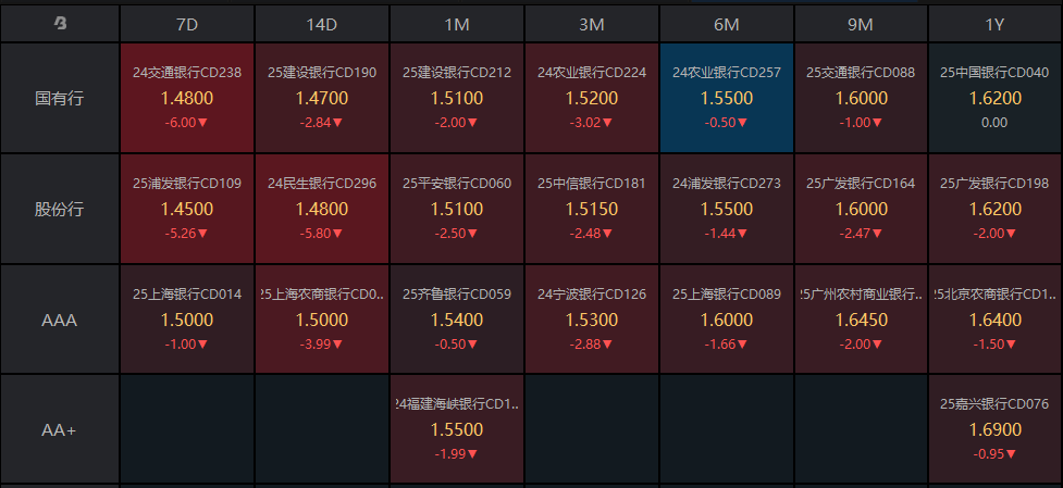 存单方面,今日3M期国股在1.505%-1.54%位置需求较好,较前一日下行3.02bp,1Y期国股报在1.615%-1.63%的位置,较前一日变化不大,AAA级存单方面,9M成交在1.645%,1Y成交在1.64%的位置。