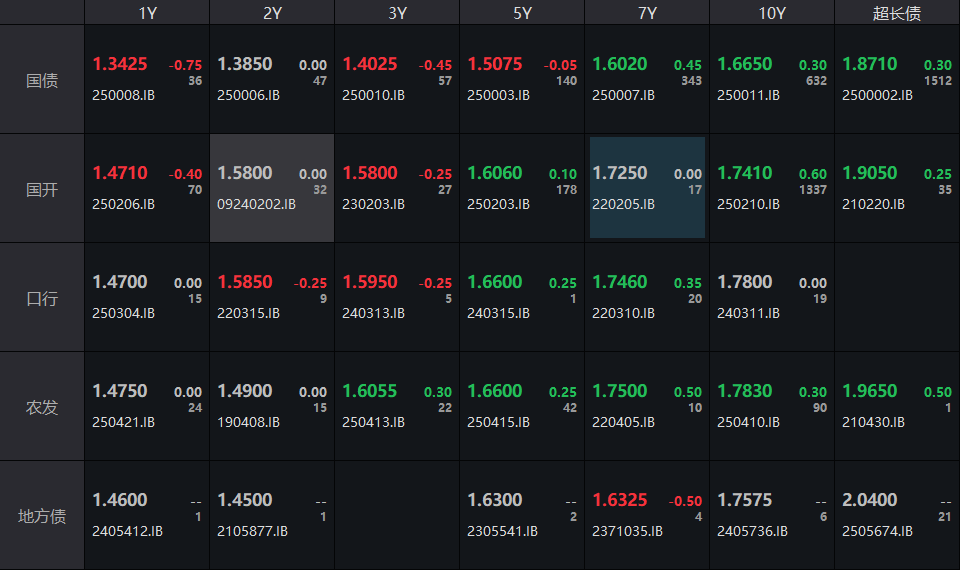 (数据来源:WIND,财联社整理)业内人士指出,日间市场继续看股做债逻辑,30年国债起开低走收跌0.22%。资金情绪有所转松,R001利率已经回到1.4%下方,权益市场抽水效果不重,所以债市仍能维持横盘震荡。现券振幅空间过窄,市场向久期要收益的倾向明显,30年现券交易量大幅高于10年国债国开。下午四点左右,央行发布取消对债券回购的质押券进行冻结的规定征求意见稿,利率债短端品种迅速翻红,30年国债收益率先下行1bp后又迅速反弹回1.8725%附近。