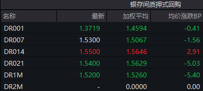 银银间回购定盘利率表现分化。FDR001持平报1.47%;FDR007跌4.0个基点报1.49%;FDR014涨4.0个基点报1.55%。银行间回购定盘利率多数下跌。FR001跌4.0个基点报1.5%;FR007跌4.0个基点报1.5%;FR014涨2.0个基点报1.61%。银存间回购利率多数下行: