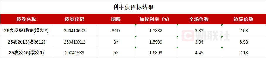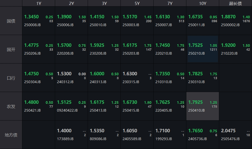 银行间主要利率债收益率全线上行,截至下午16:30分,10年期国债活跃券250011收益率上行0.95bp报1.6735%,10年期国开债活跃券250210收益率上行1.05bp至1.7525%,30年期国债活跃券2500002收益率上行1.4BP至1.887%。