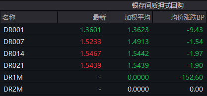 银行间回购定盘利率多数下跌。FR001跌9.0个基点报1.41%;FR007持平报1.5%;FR014跌3.0个基点报1.58%。