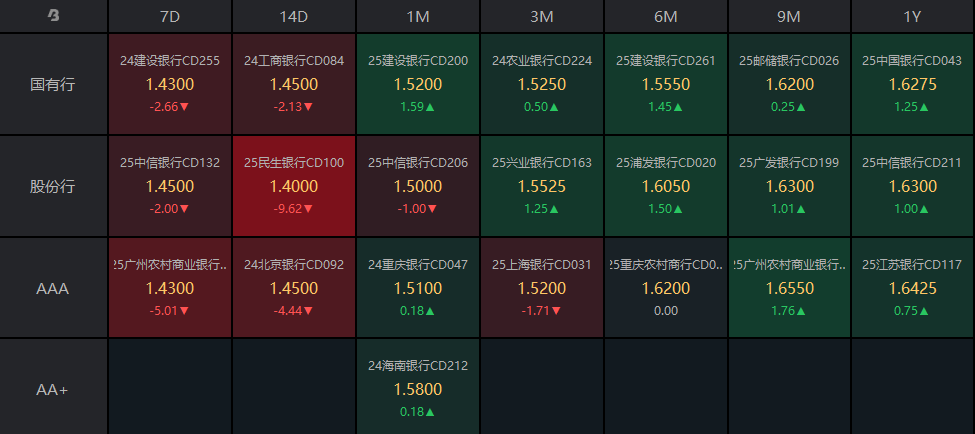 存单方面,今日3M期国股在1.50%-1.54%位置需求较好,较前一日上行1bp,1Y期国股报在1.62%-1.64%的位置,较前一日上行1.25bp,AAA级存单方面,9M成交在1.655%,1Y成交在1.6425%的位置。
