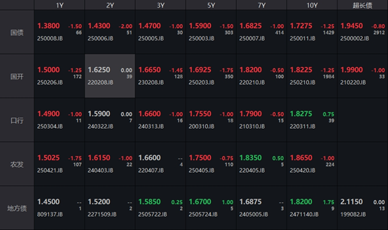 银行间主要利率债收益率多数下行,截至下午16:30分,10年期国债活跃券250011收益率下行1.25bp报1.7275%,10年期国开债活跃券250210收益率下行1.25bp报1.8225%,30年期国债活跃券2500002收益率下行0.8bp报1.945%。