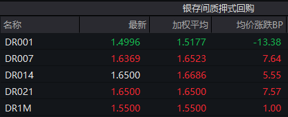 银银间回购定盘利率多数上涨。FDR001跌14.0个基点报1.53%;FDR007涨8.0个基点报1.66%;FDR014涨6.0个基点报1.66%。