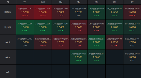 存单方面,国股行收益率整体下跌。今日6M期国股在1.62%~1.64%位置需求较好,1Y期国股报在1.63%的位置,较前一交易日下行1.67bp。二级存单方面,3M国股成交在1.57%附近,较前一交易日持平,1Y国股成交在1.67%位置,较前一交易日下行1bp。
