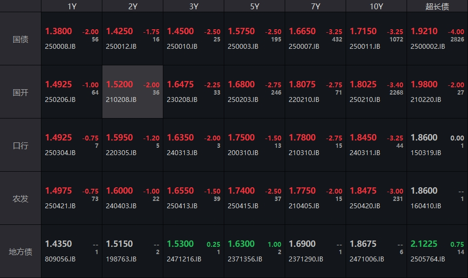 银行间主要利率债收益率全线下行,截至下午16:30,10年期国债活跃券250011收益率下行3.25bp报1.715%,30年期国债活跃券2500002收益率下行4bp报1.921%,10年期国开活跃券250210收益率下行3.4bp报1.8025%。