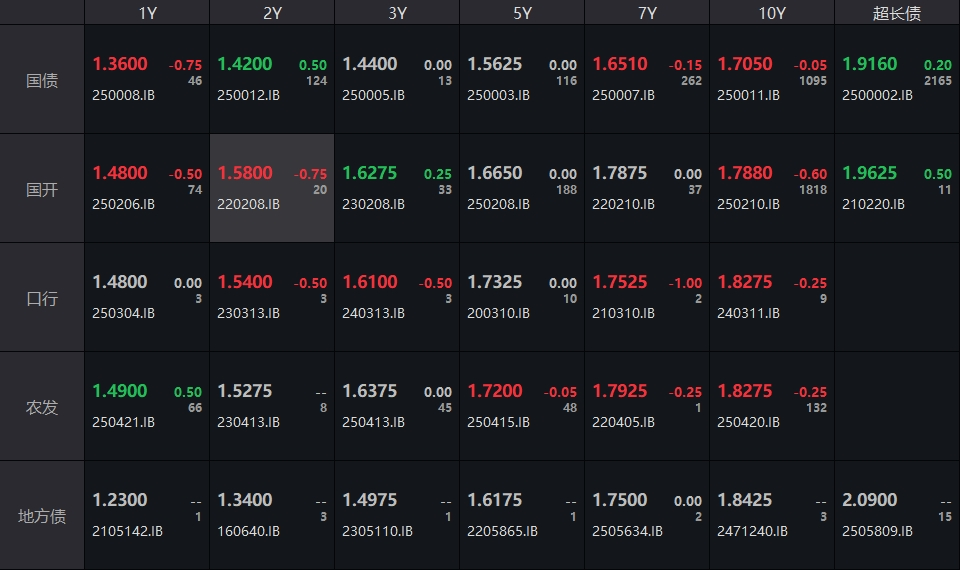 银行间主要利率债收益率涨跌不一,截至下午16:30,10年期国债活跃券250011收益率下行0.05bp报1.705%,30年期国债活跃券2500002收益率上行0.2bp报1.916%,10年期国开活跃券250210收益率下行0.6bp报1.788%。