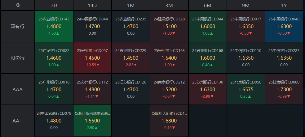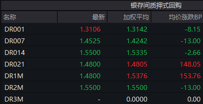 银银间回购定盘利率全线下跌。FDR001跌8.0个基点报1.32%;FDR007跌14.0个基点报1.46%;FDR014跌7.0个基点报1.53%。