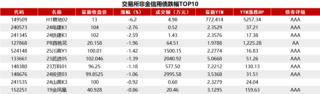 据Choice 数据统计显示,今日交易所市场非金信用债跌幅排行前五的分别是:H1碧地02、24电建K1、24铁建K1、PR酉桃花、25川高Y1。具体如下: