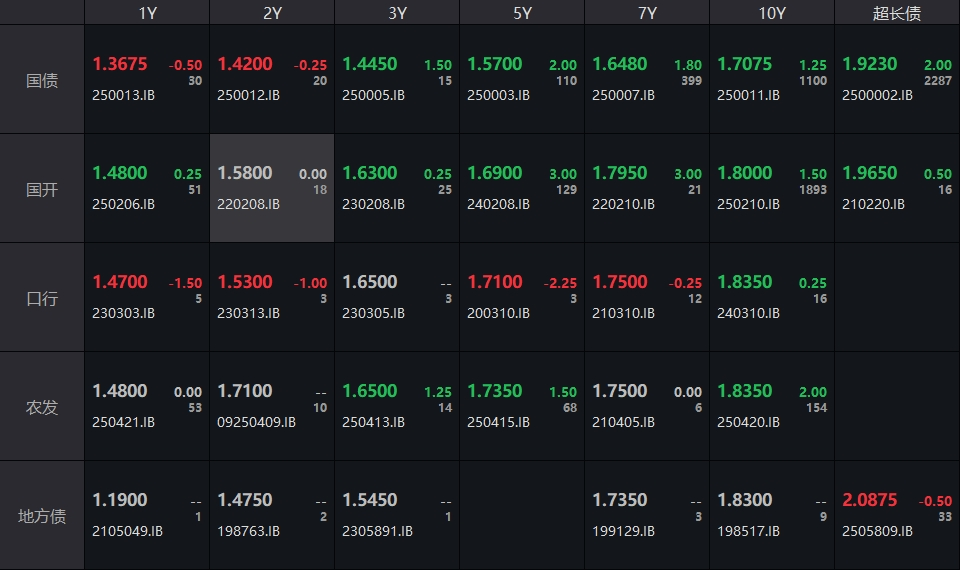 银行间主要利率债收益率多数上行,截至下午16:30,10年期国债活跃券250011收益率上行1.25bp报1.7075%,30年期国债活跃券2500002收益率上行2bp报1.923%,10年期国开活跃券250210收益率上行1.5bp报1.8%。