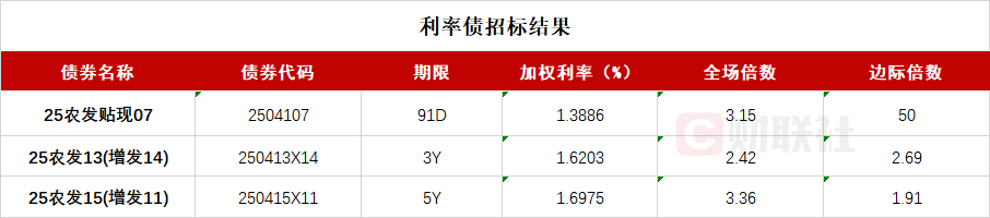 中国农业发展银行2025年第一期科技创新债券已招标结束,中标收益率1.65%,全场倍数6.42,边际倍数3.11。