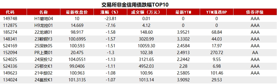 据Choice 数据统计显示,今日交易所市场非金信用债跌幅排行前五的分别是:H1碧地04、H9龙控01、22龙湖01、23鞍钢Y3、25深铁05。具体如下: