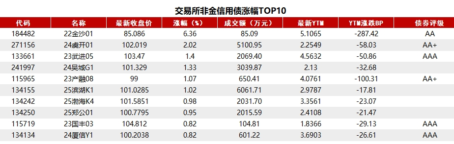 据Choice 数据统计显示,今日交易所市场非金信用债涨幅排行前五的分别是:22金沙01、24虞开01、23武进05、24吴城G1、23产融08。具体如下: