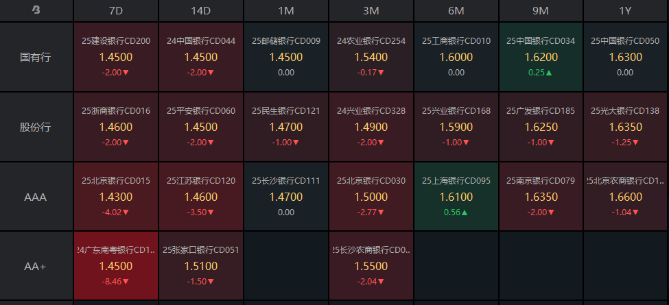 银行间回购定盘利率全线下跌。FR001跌2.0个基点报1.35%;FR007跌2.0个基点报1.48%;FR014跌3.0个基点报1.52%。
