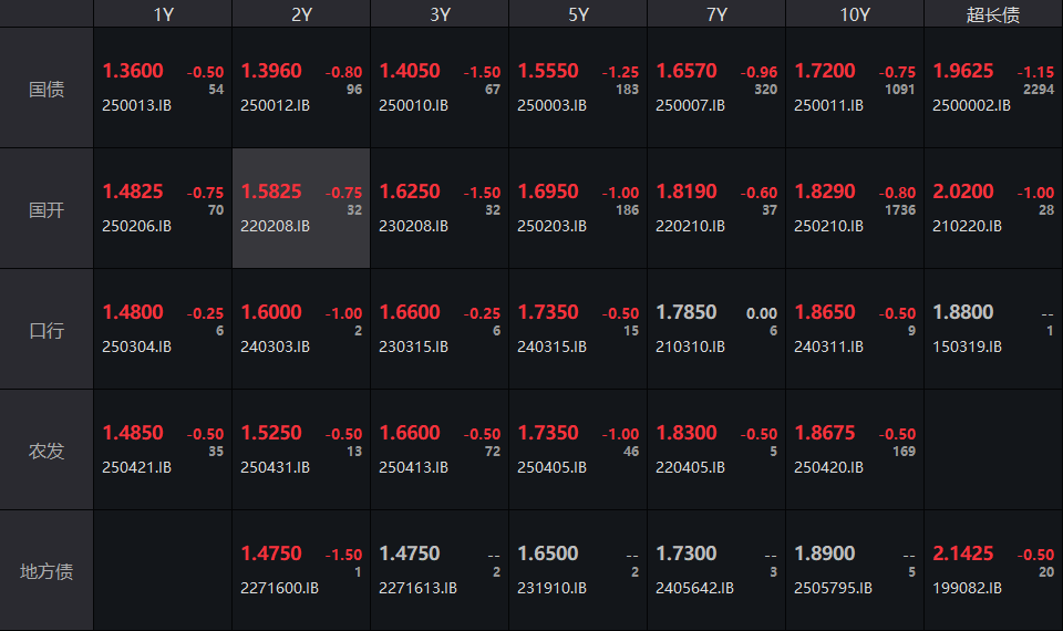 银行间主要利率债收益率全线下行,截至下午16:30,10年期国债活跃券250011收益率下行0.75bp报1.72%,30年期国债活跃券2500002收益率下行1.2bp报1.962%,10年期国开活跃券250210收益率下行0.8bp报1.829%。