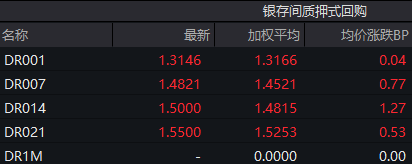 银行间回购定盘利率多数上涨。FR001持平报1.36%;FR007涨2.0个基点报1.48%;FR014涨1.0个基点报1.51%。