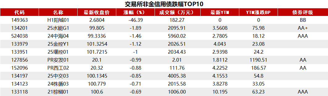 据Choice 数据统计显示,今日交易所市场非金信用债跌幅排行前五的分别是:H1阳城01、25水能G1、24中海04、25金控Y1、25堰控01。具体如下: