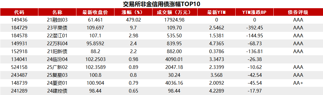 据Choice 数据统计显示,今日交易所市场非金信用债涨幅排行前五的分别是:21融创03、23平果债、22潜江01、22万科04、21阳新债。具体如下: