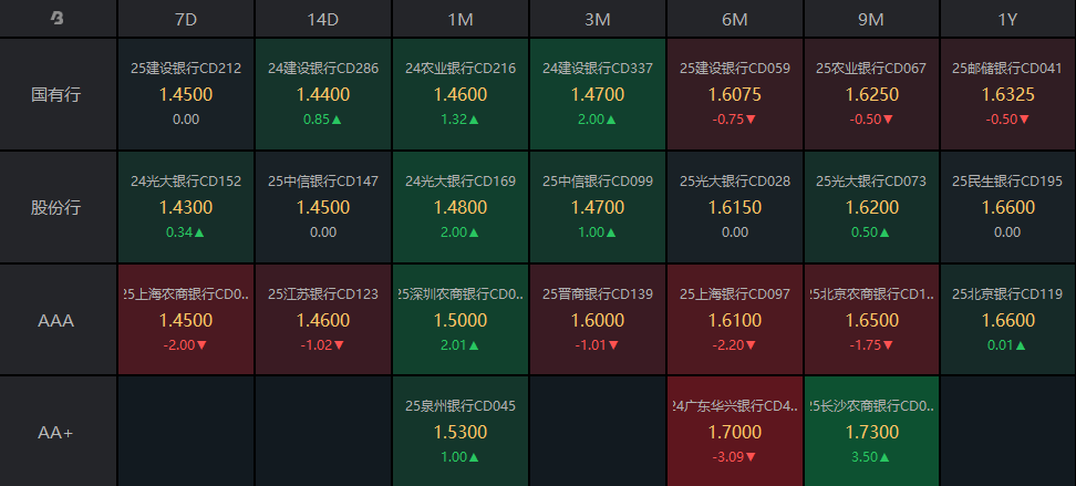 存单方面,今日3M期国股在1.46%-1.54%位置需求较好,较前一日上行2bp,1Y期国股报在1.6325%-1.645%的位置,较前一日下行0.5bp,AAA级存单方面,9M成交在1.65%,1Y成交在1.66%的位置。