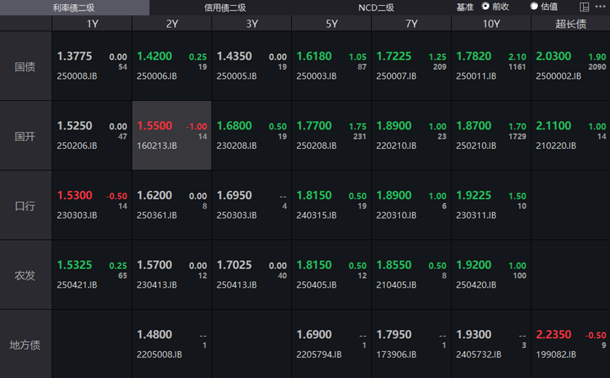 具体来看,国债期货收盘全线下跌,30年期主力合约跌0.12%报115.980元,10年期主力合约跌0.18%报107.660元,5年期主力合约跌0.07%报105.370元,2年期主力合约跌0.01%报102.318元。银行间主要利率债收益率多数上行,截至下午16:30分,10年期国债活跃券250011收益率上行2.1bp报1.782%,10年期国开债活跃券250210收益率上行1.7bp至1.87%,30年期国债活跃券2500002收益率上行1.9BP至2.03%。