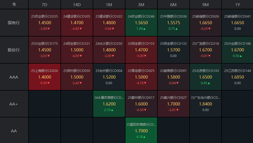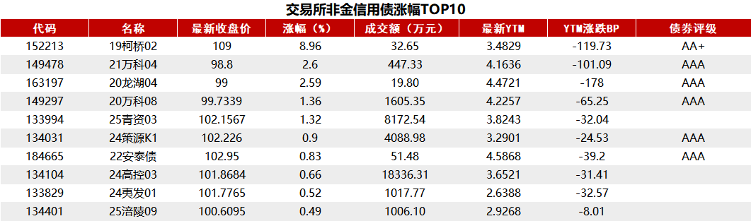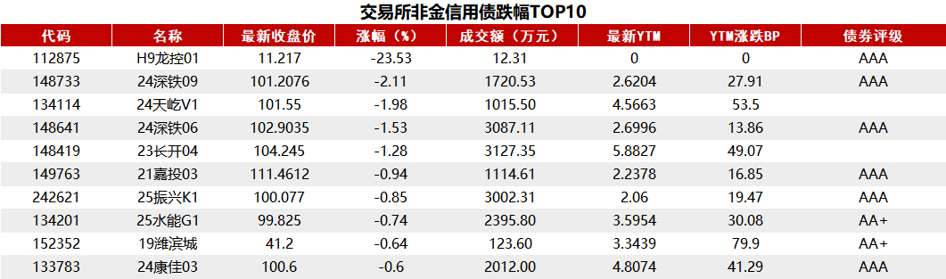一级市场方面,财政部两期新发国债中标利率均高于中债估值,10年、30年期国债加权中标利率分别为1.83%、2.15%。据Choice数据统计,今日交易所市场非金信用债涨幅排行前五的分别是:19柯桥02、21万科04、20龙湖04、20万科08、25青资03;跌幅排行前五的分别是:H9龙控01、24深铁09、24天屹V1、24深铁06、23长开04。存单方面,今日6M期国股在1.64%点位需求较好,1Y期国股报在1.65%的位置。