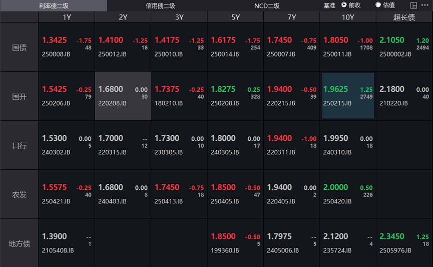 具体来看,国债期货收盘多数上涨,30年期主力合约跌0.11%报114.740元,10年期主力合约涨0.07%报107.580元,5年期主力合约涨0.14%报105.590元,2年期主力合约涨0.06%报102.410元。银行间主要利率债收益率涨跌不一,截至下午16:30,10年期国债活跃券250011收益率下行1bp报1.805%,30年期国债活跃券2500002收益率上行1.2bp报2.105%,10年期国开活跃券250215收益率上行1.25bp报1.9625%。