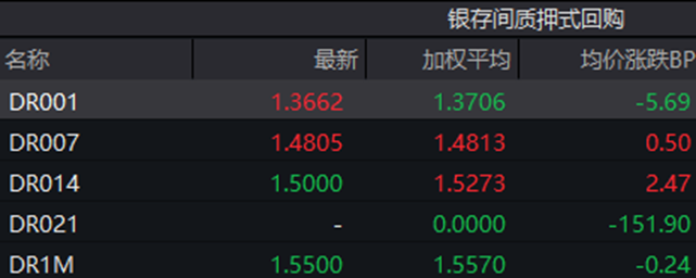 资金面方面,Shibor短端品种多数上行。隔夜品种下行5.6BP报1.369%;7天期上行1.7BP报1.466%;14天期上行0.9BP报1.51%;1个月期上行0.2BP报1.53%。银行间回购定盘利率全线下跌。FR001跌4.0个基点报1.43%;FR007跌1.0个基点报1.49%;FR014跌1.0个基点报1.52%。银银间回购定盘利率多数下跌。FDR001跌6.0个基点报1.38%;FDR007跌2.0个基点报1.48%;FDR014持平报1.5%。