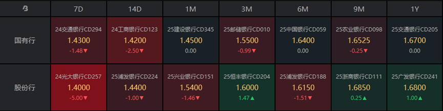存单方面,今日6M国股报在1.60%的位置,1Y期国股报在1.68%的位置,较前一交易日持平。二级存单方面,3M国股成交在1.55%附近,较前一交易日下行1bp,1Y国股成交在1.67%位置,较前一交易日持平。