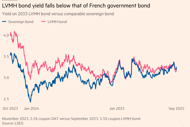以法国奢侈品巨头LVMH发行的2033年到期债券为例:该债券在2024年及2025年初的收益率曾比可比法国国债高出0.2-0.6个基点,但上周收益率已低出了0.07个基点,创下两年前发行以来的最大倒挂幅度。