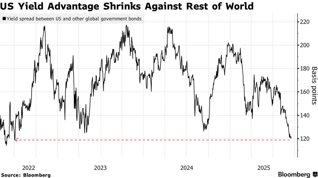 衡量本轮美债相对涨势的一个直观指标是:美国国债相对于全球同类债券的收益率溢价虽仍显著,但利差已降至了三年来的最低点。