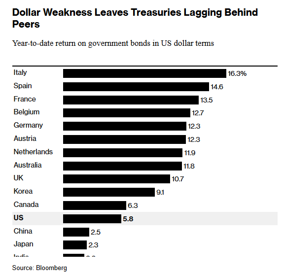 当然,尽管今年以本币计价,美国国债表现跑赢了全球其他主要国债市场。但若考虑汇率波动因素,情况则截然不同……