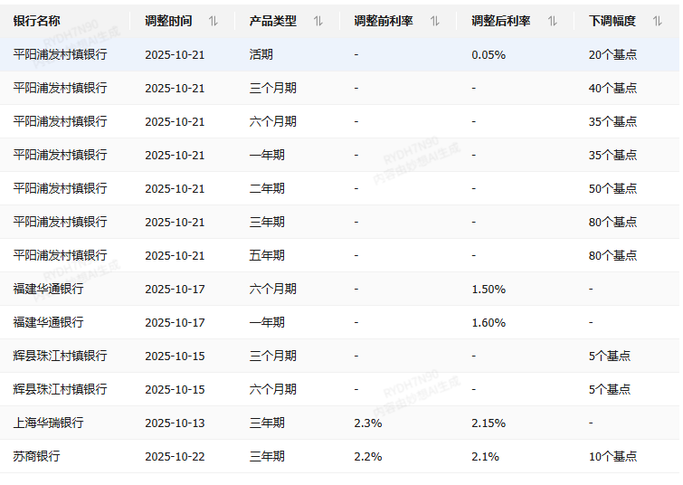 近日,多家中小银行加快存款降息步伐。10月以来,平阳浦发村镇银行、福建华通银行、辉县珠江村镇银行等下调利率,部分产品降幅达80基点。