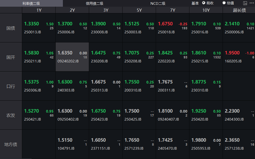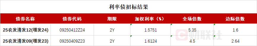 一级市场方面,农发行2年(09250412Z24.IB)、2年(09250409Z23.IB)期金融债中标收益率分别为1.5751%、1.6124%,全场倍数分别为5.35、4.5,边际倍数分别为1.6、2.64。国开行2年、5年、10年期金融债中标收益率分别为1.5250%、1.7027%、1.8779%,全场倍数分别为3.18、3.4、5.13,边际倍数分别为1.88、2.44、6.16。