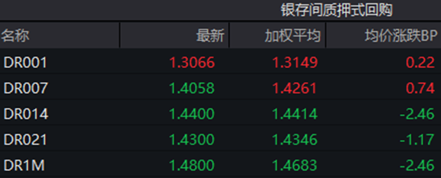银行间回购定盘利率均与此前持平。FR001报1.3600%,与前一交易日持平;FR007报1.4700%,与前一交易日持平;FR014报1.4900%,与前一交易日持平。