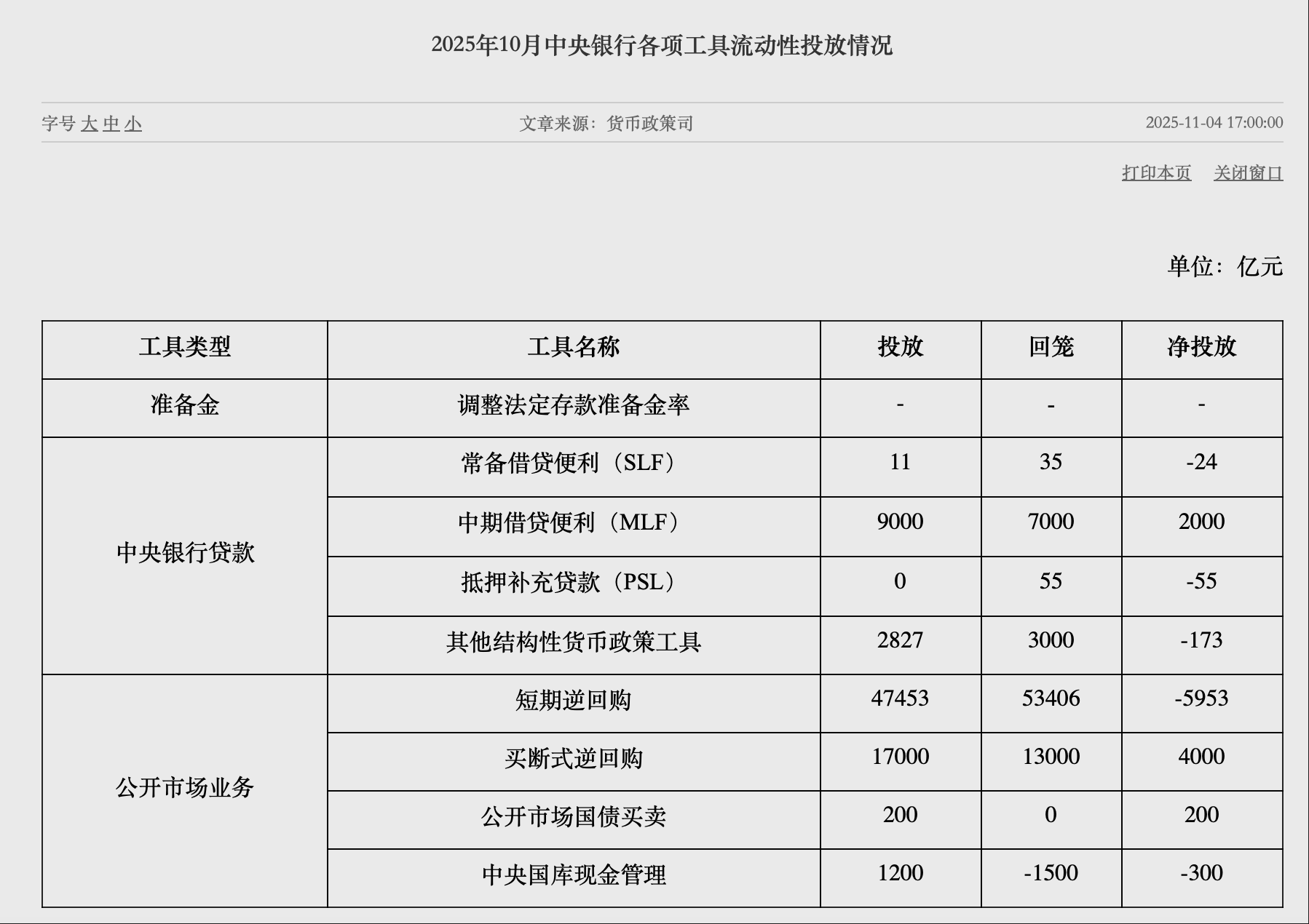 自年初暂停的公开市场国债买卖操作在10月份已经恢复,这一举措对金融市场影响深远。11月4日,中国人民银行(以下简称“央行”)公布2025年10月中央银行各项工具流动性投放情况。数据显示,10月份,央行开展公开市场国债买卖操作,净投放200亿元,有效调节了市场流动性。